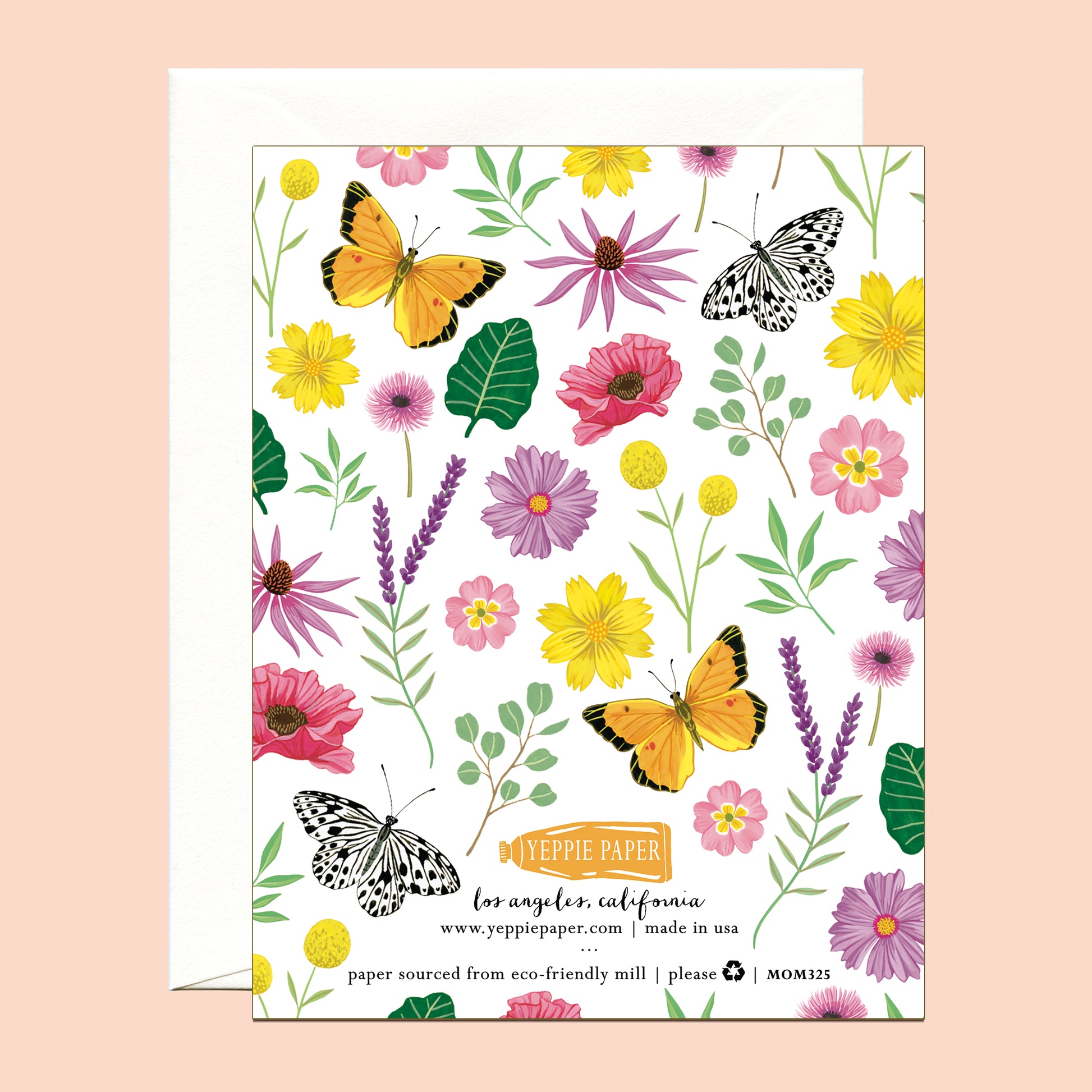 - Features butterflies and a variety of beautiful flowers. Illustration continues from the front to the back of the card!