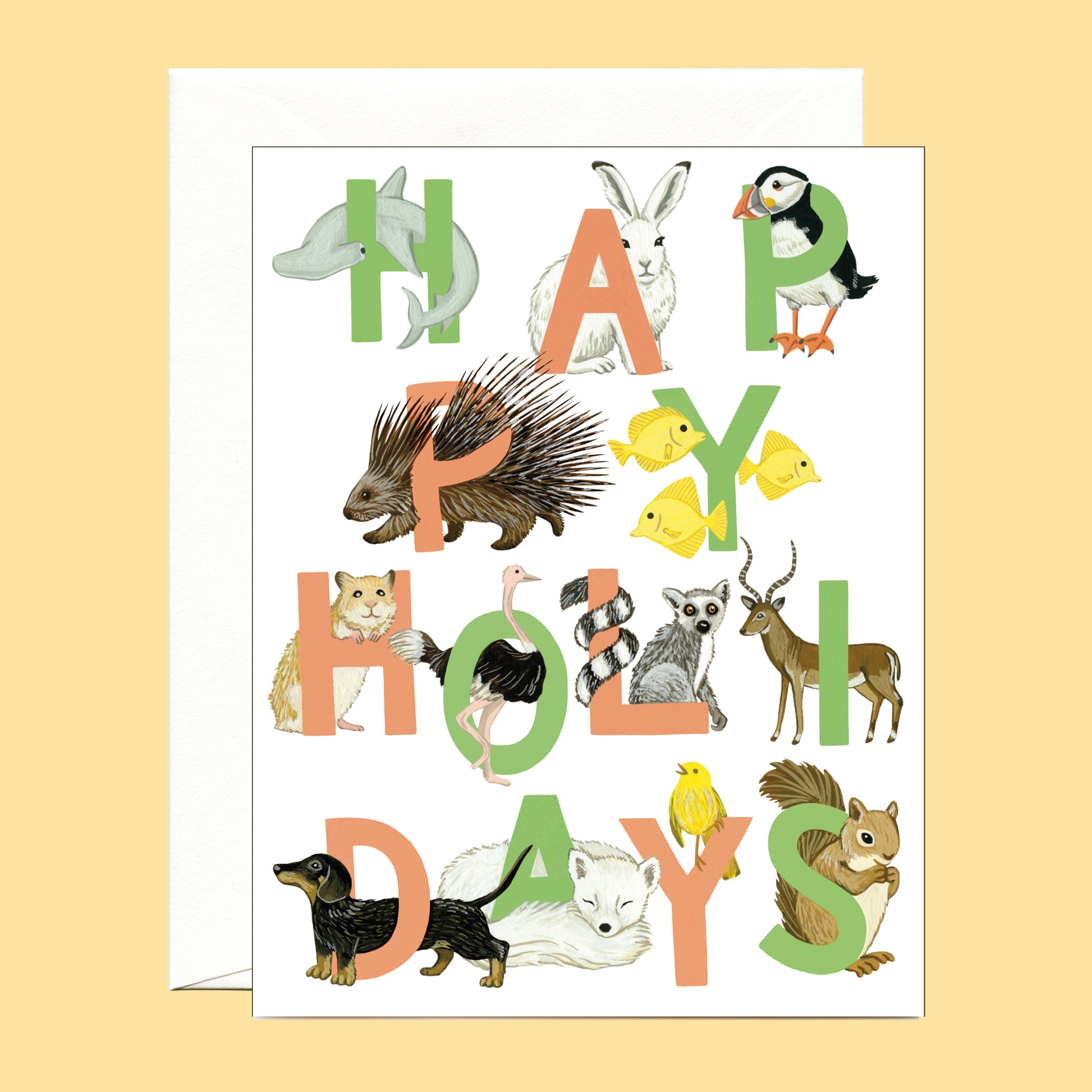 - Features a fun menagerie of animals that are paired with the letter they start with. "H" for Hammerhead Shark, "A" for Arctic Hare, "P" for Puffin, "P" for Porcupine, "Y" for Yellow Fish, "H" for Hamster, "O" for Ostrich, "L" for Lemur, "I" for Impala, "D" for Dachshund, "A" for Arctic Fox, "Y" for Yellow Finch, "S" for Squirrel. The illustration continues from the front to the back of the card!