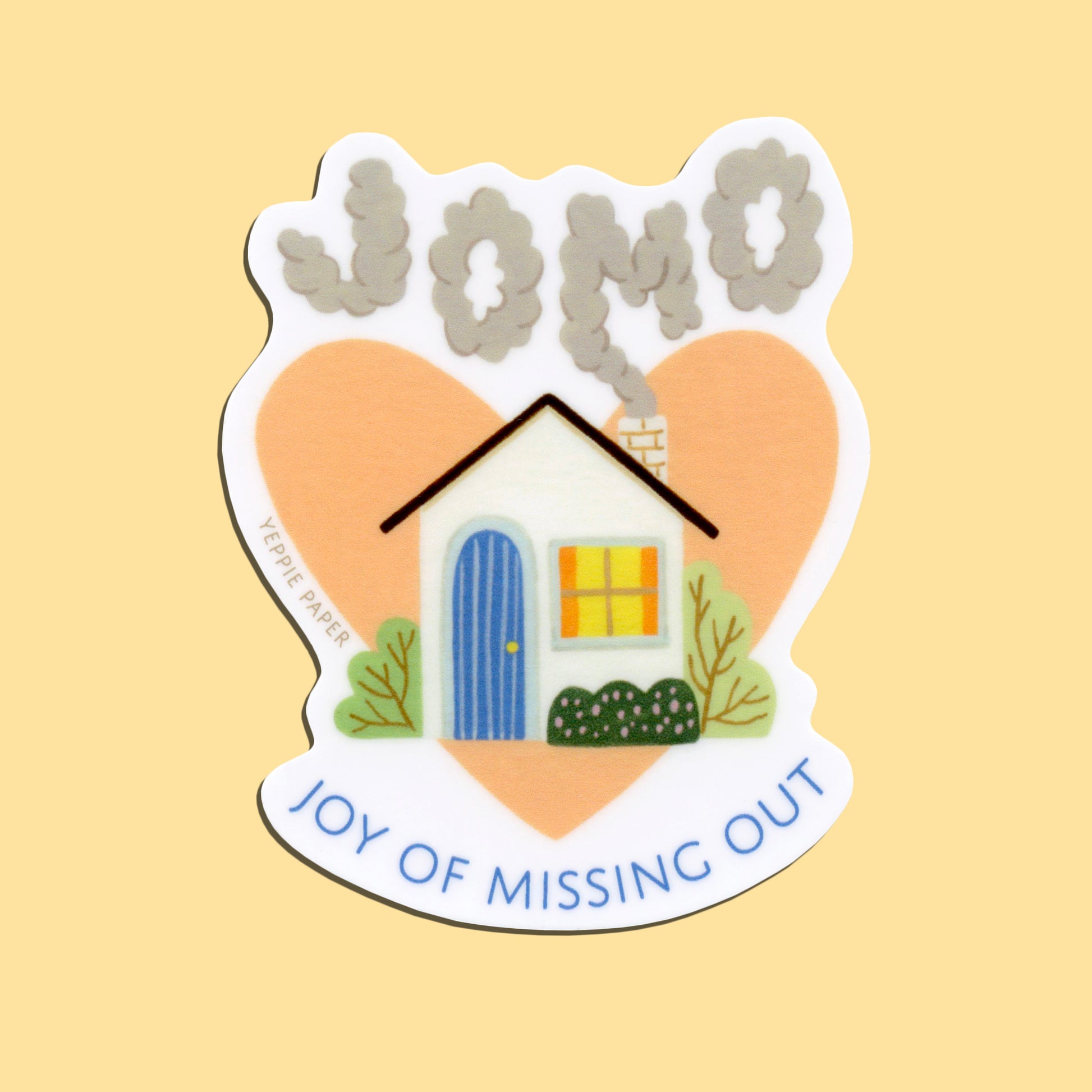 - Features a cozy house with smoke coming out of the chimney that spells out "JOMO"