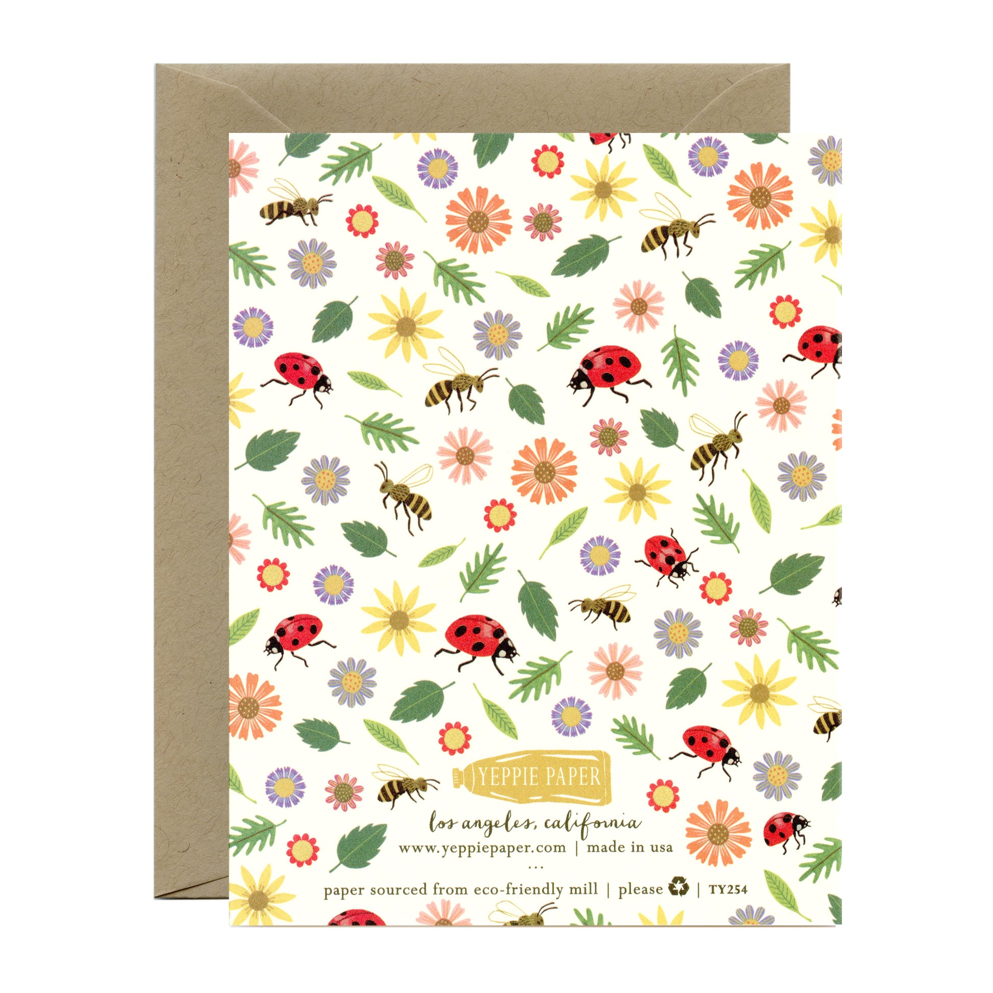 - Features a variety of wild flowers with ladybugs and bees. The illustration continues from the front to the back of the card!
